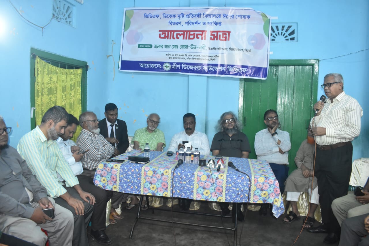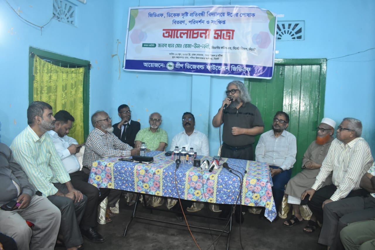 গ্রীন ডিসএ্যাবল্ড ফাউন্ডেশন (জিডিএফ) উপদেষ্টা, বিশিষ্ট সংগীত শিল্পী হিমাংশু বিশ্বাসের সভাপতিত্বে ও মহাসচিব ও নির্বাহী পরিচালক মো. বায়জিদ খানের সঞ্চালনায় অনুষ্ঠানে বিশেষ অতিথির বক্তব্য রাখেন, জাতীয় চক্ষু বিজ্ঞান ইন্সটিটিউট এর সহযোগী অধ্যাপকও বিশিষ্ট সঙ্গীত শিল্পী ডা. জহিরুল ইসলাম অচিনপুরী, সিলেট প্রেসক্লাবের সাবেক সভাপতি ইকবাল সিদ্দিকী, দৈনিক যুগান্তরের সিলেট ব্যুরো প্রধান সংগ্রাম সিংহ, সিলেট জেলা সমাজসেবা কার্যালয়ের সহকারি পরিচালক মোহাম্মদ রফিকুল হক। স্বাগত বক্তব্য রাখেন জিডিএফ এর সহ সভাপতি এডভোকেট রকিব আলী খান।